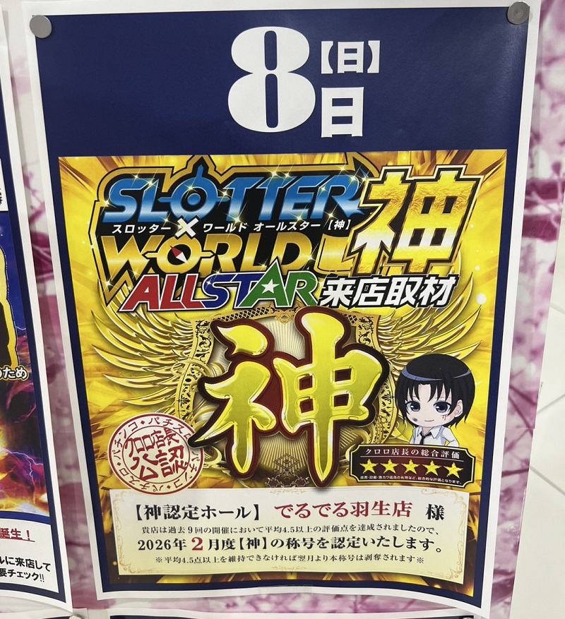2月8日 でるでる羽生店|スロッター✕ワールドALL STAR【神】結果