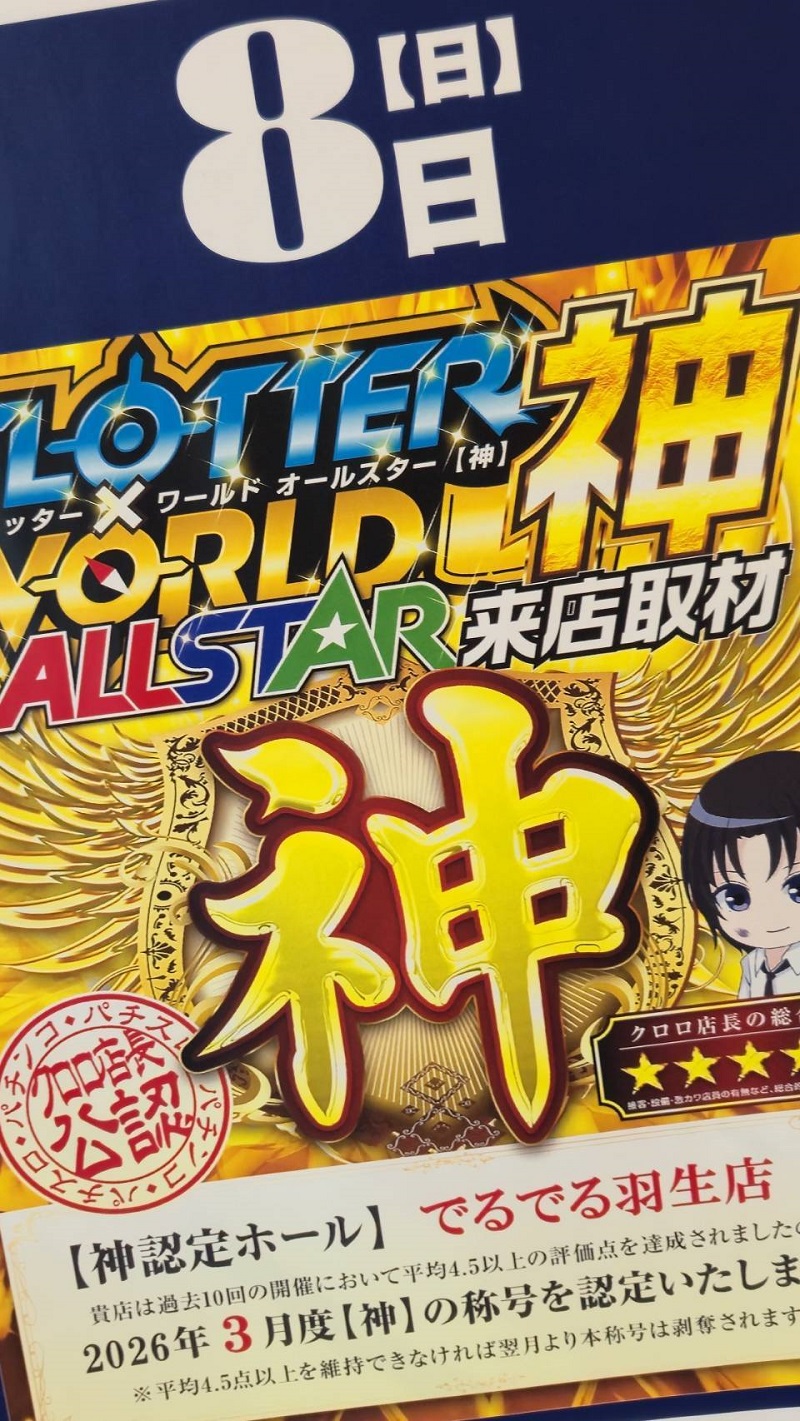 3月8日 でるでる羽生店|スロッター✕ワールドALL STAR【神】結果