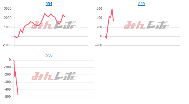 まず1箇所目はファンキージャグ2で、554番台が+2,070枚を炸裂。